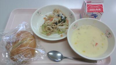 今日の給食:牛乳、米粉入りシュガーパン、コーンシチュー、切り干し大根のサラダ