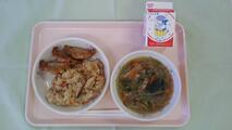 今日の給食:牛乳、中華おこわ、ぎょうざ、春雨スープ