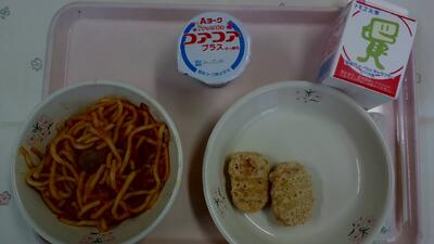 今日の給食:牛乳、スパゲティナポリタン、チキンナゲット、ヨーグルト