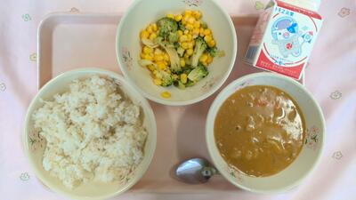 今日の給食:牛乳・カレーライス・ブロッコリーのサラダ
