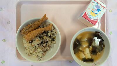 今日の給食:牛乳・わかめごはん・和風とり塩から揚げ・けんちん汁