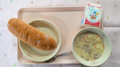 今日の給食:牛乳・揚げパン・きのこのクリーム煮