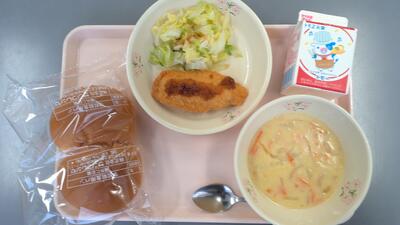 今日の給食:牛乳・はちみつパン・たらフライ・ボイルキャベツ・豆乳クリームスープ