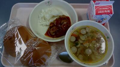 11月28日 投稿: 元郷南 (13:50) カテゴリー: 今日の給食 今日の給食:牛乳、子供パン、ハンバーグデミグラスソース、こふきいも、ペイザンヌスープ 今日はハンバーグです。ハンバーグにかけるソースはケチャップ、中濃ソース、デミグラスソースを合わせたもの。 美味しいソースはパンとの相性もバッチリ。いろんな食べ方で楽しんでいました。 -