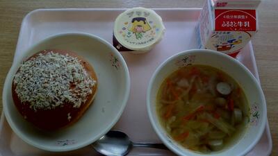 今日の給食:牛乳、焼きカレーパン、コンソメスープ、プリン