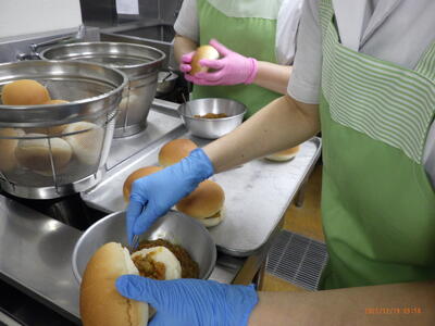 焼きカレーパンのカレーを朝から作り、6人で具をパンにはさみ、パン粉を付け焼きました。